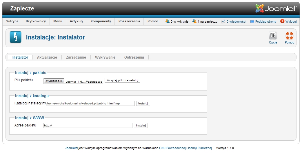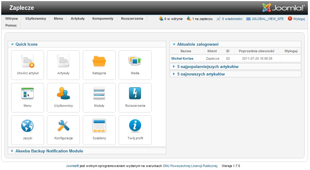 Po skończeniu procesu możemy cieszyć się świeżością naszego systemu, który pracuje już jako Joomla 1.7.0.