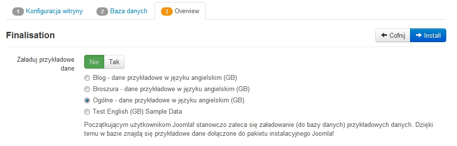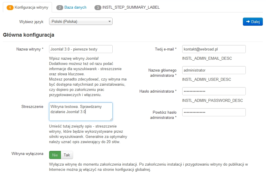 Tak więc możemy brnąć dalej. Jak informuje nas instalator, do zakończenia procesu prowadzą nas trzy kroki. Pierwszym z nich jest standardowe wypełnienie podstawowych informacji o witrynie. W odniesieniu do poprzedniej Joomla! 2.5 zmieniła się głównie forma prezentacji opcji.