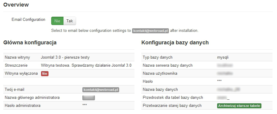 Kiedy już dostosujemy środowisko pracy, pojawi nam się (w razie niezgodności) ekran sprawdzający poprawność konfiguracji. O ile w przypadku ustawień zalecanych możemy sobie pozwolić na naginanie niektórych opcji, tak w wymaganych polach na „Nie” ustawione może być tylko zapisywanie w configuration.php. Dopóki wszystkie pola nie będą zielone, instalator nie ruszy ani kroku dalej.