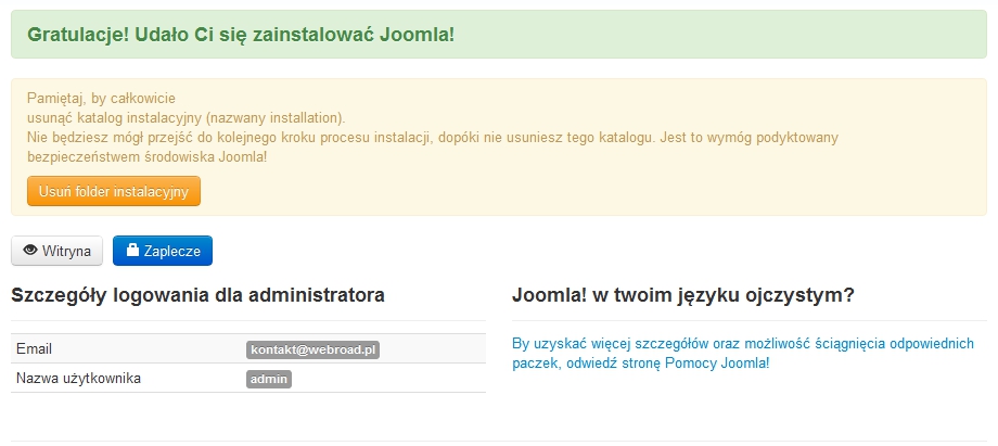No i udało się. Instalacja zakończona. Powinniśmy jeszcze usunąć katalog installation i już możemy cieszyć się (lub marudzić) podczas testów Joomla! 3.0.