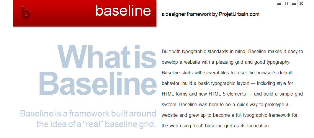 Baseline jest typowym framework’iem dla tworzenia stylów CSS. Zawiera w sobie podstawowe układy typograficzne, jak i proste szkielety stron HTML5. Dodatkowo odpowiada za ostylowanie wszystkich, nowych elementów HTML5, oraz elementów formularzy.