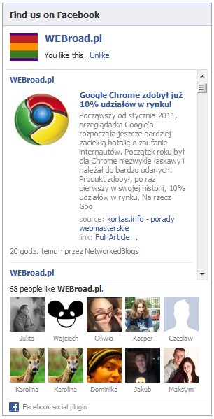 Niezwykle popularne narzędzie. Każdy, kto posiada swój profil na Facebook’u (np. profil swojej strony), umieszcza ten komponent, aby internauci mogli 'polubić’ ją lub przeczytać co nowego umieściliśmy na tablicy. Jeśli chcemy, mamy możliwość wyłączenia widoku twarzy lub ostatnich wpisów.