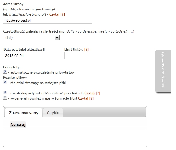 Jeżeli nasza witryna zwiera mniej niż 500 podstron możemy użyć świetnego narzędzia jakim jest www.xml-sitemaps.com. Wystarczą nam dwa kroki. W pierwszym podajemy wszystkie potrzebne dane: adres URL, częstość aktualizacji treści, ostatnią modyfikację, oraz ustalanie priorytetów. Potem klikamy przycisk START i czekamy na zakończenie operacji.