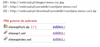 Kiedy proces tworzenia mapy dobiegnie końca, pojawi się lista wygenerowanych plików sitemap.xml. Pobieramy ją na dysk. Jeśli wszystko przebiegło pomyślnie i nasza strona spełnia wymagania dotyczące liczby podstron mniejszej niż 500, możemy przejść do punktu Zgłaszanie Mapy Strony.