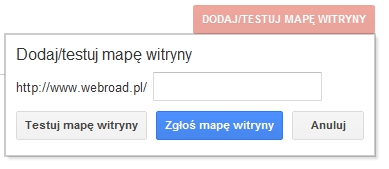 Teraz naciśnijmy czerwony button „dodaj/testuj mapę witryny”, wpisując w pole niżej adres naszego pliku sitemap.xml.
