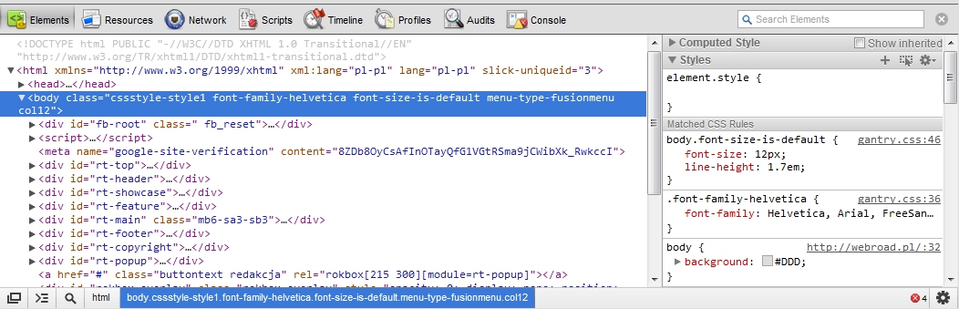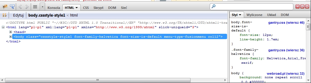 Po prawej stronie znajduje się okienko, które pokazuje nam też kod CSS, formatujący dany fragment witryny.