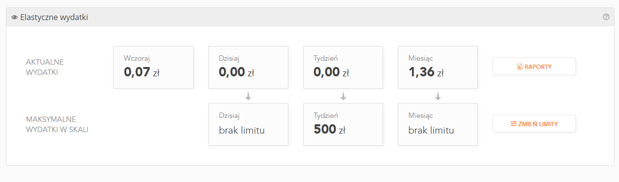 Sekcja ta pokazuje informacje na temat aktualnie posiadanych parametrów (bazowe wartości) oraz informację o dodatkowych wydatkach i ich limitach. Przy wyłączonym automatycznym skalowaniu nie było jednak mowy o dodatkowych opłatach.