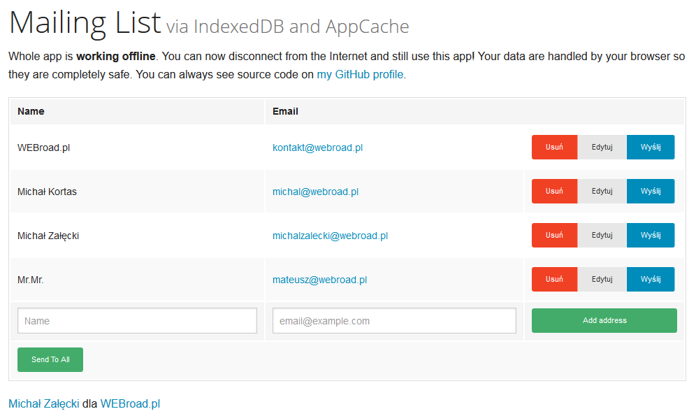 1 2 3 4 5 6 7 8 9 10 11 12 13 14 15 16 17 18 19 20 21 22 23 24 25 26 27 28 29 30 31 32 33 34 35 36 37 38 39 40 41 42 43 44 45 46 47 48 49 50 51 52 53 54 55 56 57 58 59 60 61 62 63 64 65  | <!doctype html>  <html manifest="cache.appcache" class="no-js" lang="pl_PL">      <head>          <meta charset="utf-8" />          <meta name="viewport" content="width=480, initial-scale=1.0" />          <title>Mailing Lists</title>          <link rel="stylesheet" href="stylesheets/app.css" />          <script src="bower_components/modernizr/modernizr.js"></script>      </head>      <body>          <div class="row">              <header class="large-12 columns">                  <h1>Mailing List<small> via IndexedDB and AppCache</small></h1>                  <p>Whole app is <strong>working offline</strong>. You can now disconnect from the Internet and still use this app! Your data are handled by your browser so they are completely safe. You can always see source code on <a href="https://github.com/MichalRazorZalecki/mailing-list/">my GitHub profile</a>.</p>              </header>          </div>           <div class="row">              <div class="large-12 columns">                  <table id="addresses">                      <thead>                          <tr>                              <th>Name</th>                              <th colspan="2">Email</th>                          </tr>                      </thead>                      <tbody>                      </tbody>                      <tfoot>                          <tr>                              <td>                                  <input type="text" id="new-name" name="new-name" placeholder="Name" />                              </td>                              <td>                              </td>                              <td>                                  <a href="#" id="add_address" class="button tiny success radius">Add address</a>                                  <ul id="edit_buttons" class="button-group radius">                                      <li><a href="#" id="edit_address" class="button tiny success">Save</a></li>                                      <li><a href="#" id="cancel_edit_address" class="button tiny alert">Cancel</a></li>                                  </ul>                              </td>                          </tr>                          <tr>                              <td colspan="3"><a href="#" id="send_to_all" class="button tiny success radius">Send To All</a></td>                          </tr>                      </tfoot>                  </table>              </div>          </div>           <div class="row">              <footer class="large-12 columns">                  <p><a href="http://michal.zalecki.pl">Michał Załęcki</a> dla <a href="https://webroad.pl">WEBroad.pl</a></p>              </footer>          </div>           <div id="email_error" class="reveal-modal tiny" data-reveal>              <h2>Emaill Address Error</h2>              <p>This email address is invalid. You <strong>must</strong> enter valid email, only name is optional.</p>              <a class="close-reveal-modal">&#215;</a>          </div>          <script src="bower_components/jquery/jquery.js"></script>          <script src="bower_components/foundation/js/foundation.min.js"></script>          <script src="js/app.js"></script>      </body> </html>  |