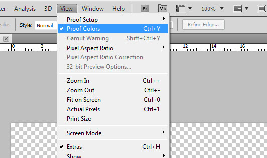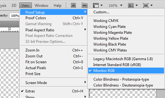 - Zaznacz opcję View -> Proof Colors oraz View -> Proof Setup -> Monitor RGB.