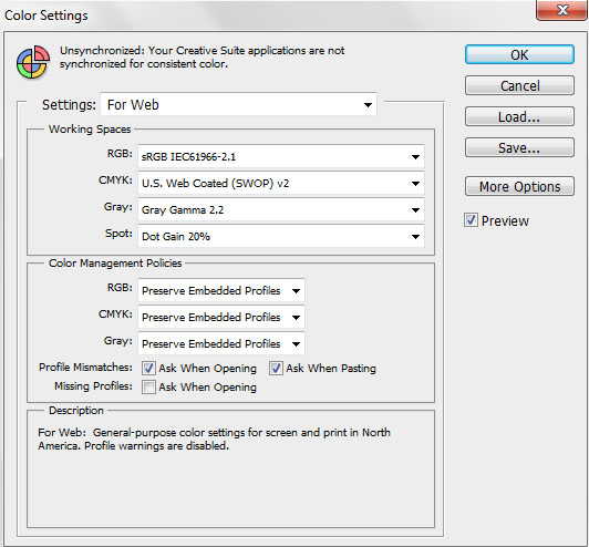 Photoshop współpracuje z Color Management Modules (CMM), który służy do konwertowania kolorów pomiędzy różnymi profilami ICC. Inaczej mowiąc, system ten umożliwia dokładne odwzorowanie kolorystyczne, umożliwia reprodukowanie kolorów. Teoretycznie więc ustawienie obszaru roboczego na sRGB oraz zaznaczenie opcji „Embed Color Profile” powinno rozwiązać problem. Niestety jednak, system ten nie jest obsługiwany przez część przeglądarek, a takie rozszerzenia jak GIF czy PNG wogóle go nie wspierają.
