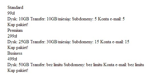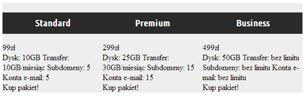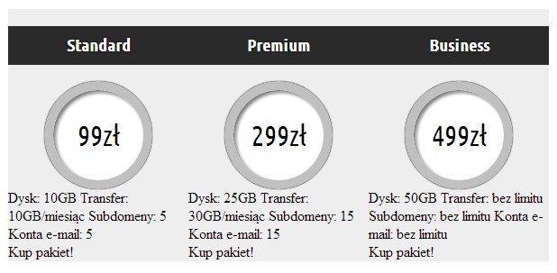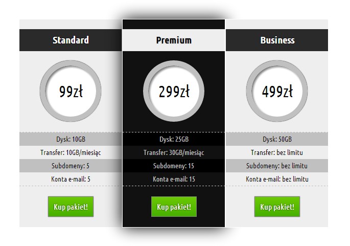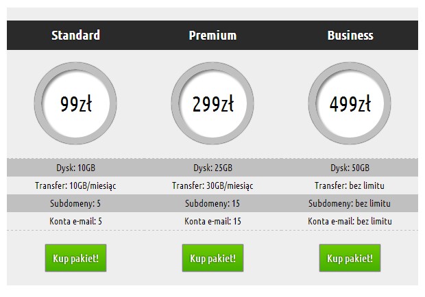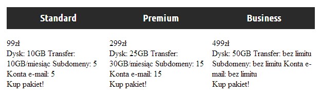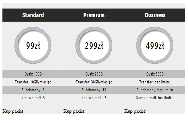 1 2 3 4 5 6 7 8 9 10 11 12 13 14 15 16 17 18 19 20 21 22 23 24 25 26 27 28 29 30 31 32 33 34 35 | <div id="tabelka"> <div class="produkt"> <div class="nazwa"><h3>Standard</h3></div> <div class="cena">99zł</div> <ul class="parametry"> <li>Dysk: 10GB</li> <li>Transfer: 10GB/miesiąc</li> <li>Subdomeny: 5</li> <li>Konta e-mail: 5</li> </ul> <div class="kup">Kup pakiet!</div> </div> <div class="produkt"> <div class="nazwa"><h3>Premium</h3></div> <div class="cena">299zł</div> <ul class="parametry"> <li>Dysk: 25GB</li> <li>Transfer: 30GB/miesiąc</li> <li>Subdomeny: 15</li> <li>Konta e-mail: 15</li> </ul> <div class="kup">Kup pakiet!</div> </div> <div class="produkt"> <div class="nazwa"><h3>Business</h3></div> <div class="cena">499zł</div> <ul class="parametry"> <li>Dysk: 50GB</li> <li>Transfer: bez limitu</li> <li>Subdomeny: bez limitu</li> <li>Konta e-mail: bez limitu</li> </ul> <div class="kup">Kup pakiet!</div> </div> </div> |